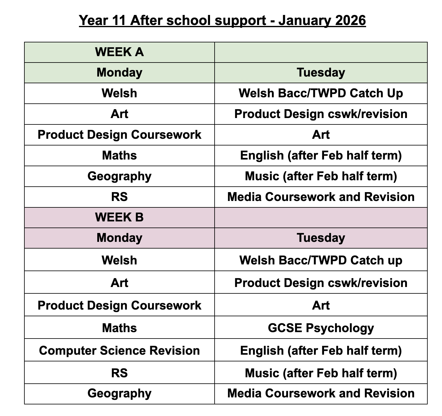 Please see below the Year 11 after school revision/support sessions that are available on Mondays and Tuesdays. Please encourage your children to attend. Diolch.